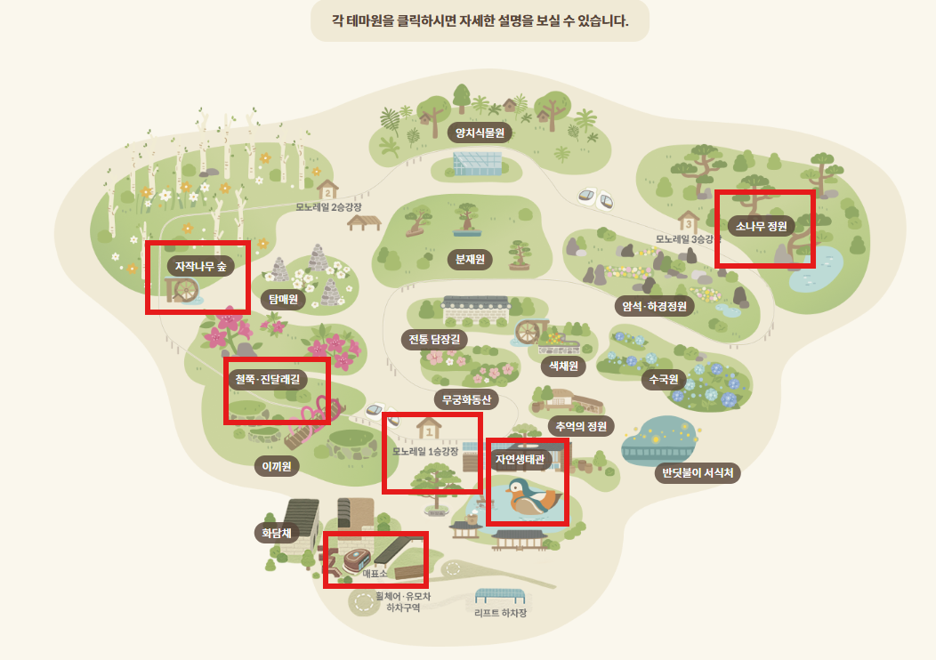 철쭉·진달래 길, 이끼원, 수국 정원 등 다양한 테마 정원을 산책할 수 있습니다.