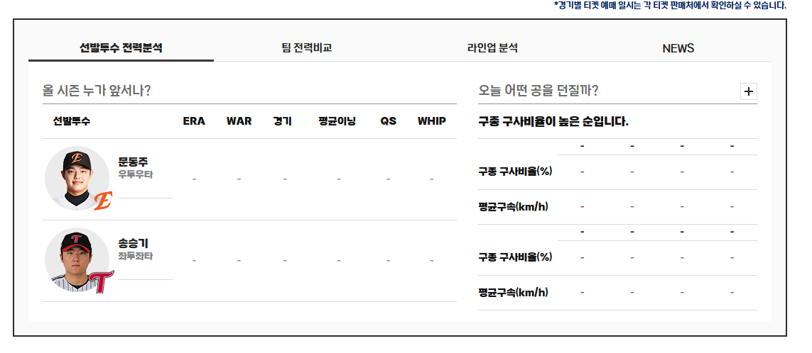 오늘의 선발 투수 및 라인업