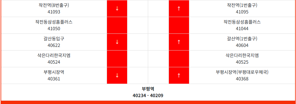 - 양재 방면: 부평시장역 1번 출구 앞 (정류장 번호: 40368)