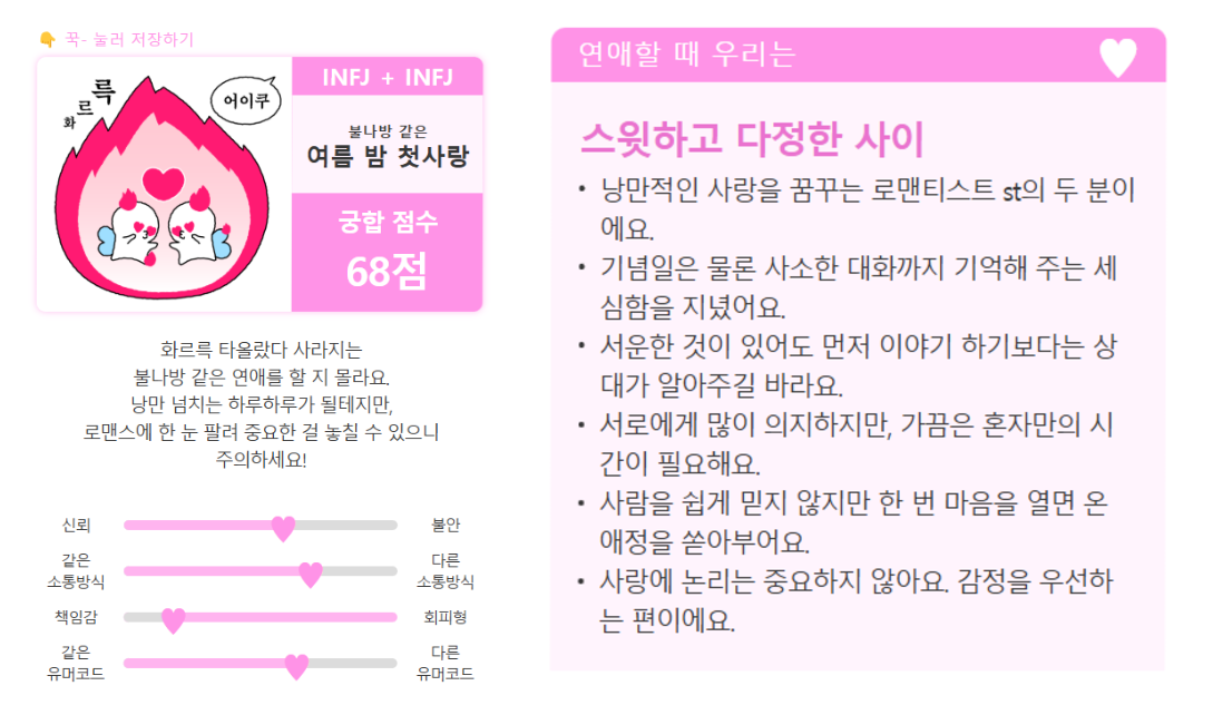 1. 상대방과 자신의 MBTI를 안다면 바로 입력하여 다음과 같은 결과를 확인할 수 있습니다. (화면은 예시입니다.)