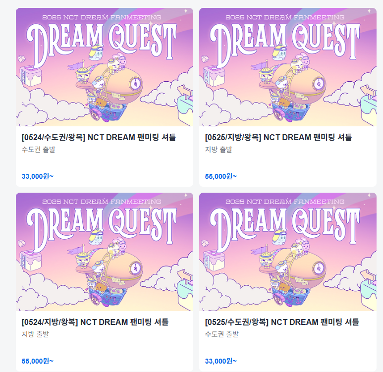 2025년 5월 24일(토), 25일(일) 인천 인스파이어 아레나에서 열리는 NCT DREAM 팬미팅 〈DREAM QUEST〉를 위한 공식 연계 셔틀버스 서비스가 카카오 T 셔틀을 통해 운영됩니다.