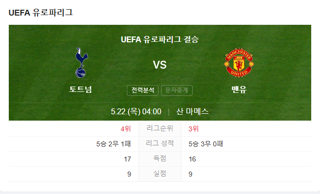 토트넘 vs 맨유 유로파리그 결승전 정보
